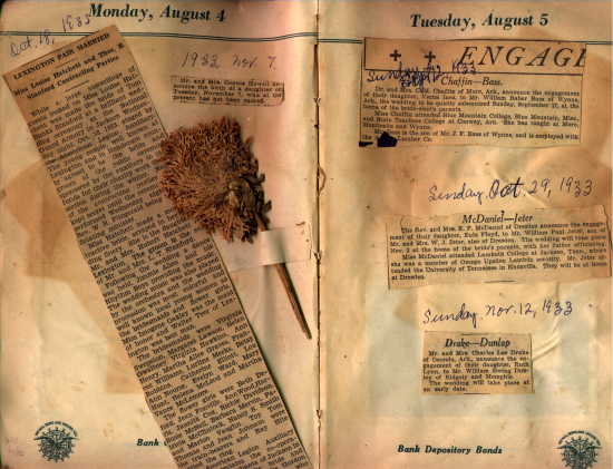 This web page presents a scrapbook created by Imogene Oakley. The scrapbook contains birth announcements, wedding announcements, obituaries, photographs, and various miscellaneous items that interested Imogene. Most items concern people she knew. Items pasted in cover two time periods — 1931-1935 and 1939-1941. Also, the items are not really in chronological order but seem to have been pasted in at a later date. The scrapbook now belongs to Brenda Kirk Fiddler.