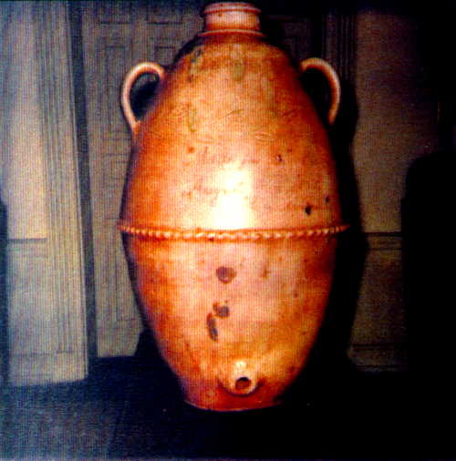 Mr. W. L. Barry of Lexington says that the pot was offered to the Tennessee State Museum about 20 years ago for $2,500. Mr. Barry was notified and furnished the photo. He was told the piece was about 5 feet in length. A doctor friend (very much into "old things") said he believed it was a water purification system that probably used layers of cheese cloth, etc., in the bottom to catch sediments. Mr. Barry thinks, considering the pot was made for a doctor, that is what it is -- a water purification system. The museum did not purchase the pottery and Mr. Barry later heard that the piece was in South Carolina.