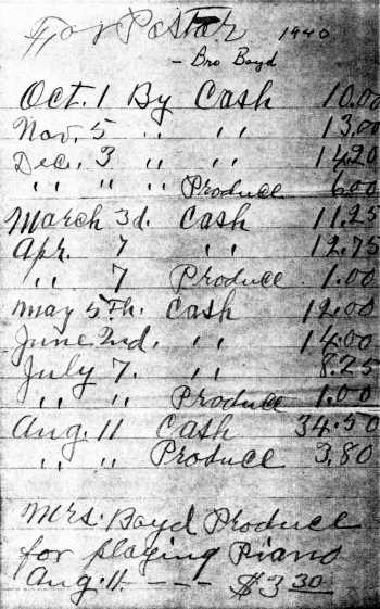 For the younger members of our congregation, we present some information concerning the finances of the church. Many times the pastors were paid with produce from the farms because of the scarcity of money. Prior to 1900 several members pledged to pay 10 cents on every monthly meeting day for missions, some pledged 5 cents per month. An adequate number of minutes of action taken by Beech River Association cost as little as 50 cents up to $2.00 up through the 1930s. Records in some cases list names of those contributing to the pastor's salary. The most affluent members paid no more than $1.50 per month, some paid 50 cents and others, 25 cents. Totals during the Great Depression rarely were more than $12.00 to $15.00--(Note the page indicating that salary paid to Bro. Boyd in 1940). Things were beginning to look up as we note his salary was often a little more than that. This paid for a preaching service and business meeting on Saturday afternoons and sometimes a worship service on Sunday. (The Sunday service was not on a regular basis. It was during these Saturday afternoon services that many members found themselves being cast out from the church membership on charges ranging from heresy, drunkeness, swearing, non-support of the church, mistreating orphans or any conduct unbecoming to a christian. Each accused person was usually given an opportunity to deny the charges with acceptable explanations or were allowed to "make their acknowledgements to the church", which we interpret to mean confess and ask forgiveness of the church, to explain their reason for non-support or whatever the offense might be. In many instances, even after many, many years excluded members came back, asked forgiveness of the church, and were received back into full fellowship.