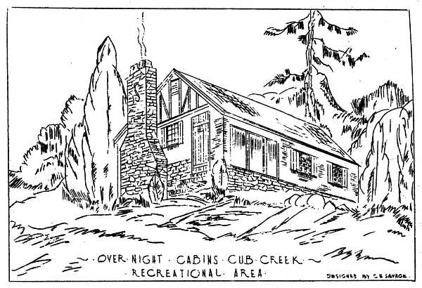 Each lake will have a bathing beach, bath house, and diving towers. Located around the shore will be a number of cabins. These sites will be serviced with electric lights, water, and sewage. A number of' picnic' areas, with camp fixtures, parking areas, and shelters will also be located around the lakes. On upper Brown's Creek Lake a 4-H Club Recreational Camp for boys and girls will be constructed.
