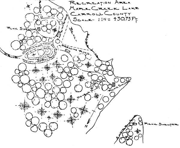 The dam at Maple Creek will be 730 feet long, 22½ feet high with low water depth of 15 feet, and will require 35,000 cubic yards of earth. The lake will cover 93 acres at a cost of $188.01 per acre.