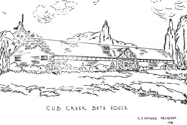 The camp is laid out on the cottage plan with about 16 cottages, 2 shower houses, and 2 council houses with a mess hall and recreation lodge. This camp is to have modern plumbing and electric lighting.