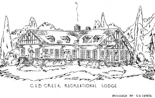 The main scheme calls for the development of the main ridge coming down between the two main arms of the lake, The center of this development will be the Recreational. Lodge located on a strategic spot overlooking the lake toward the dam on one side and up the other arm of the lake. The exterior of the Recreational Lodge is designed in a manner to fit into its surroundings and the area there about will be planted in a naturalistic style with restraint as the keynote. On the main road coming to the Lodge there will be ample parking space for this area.