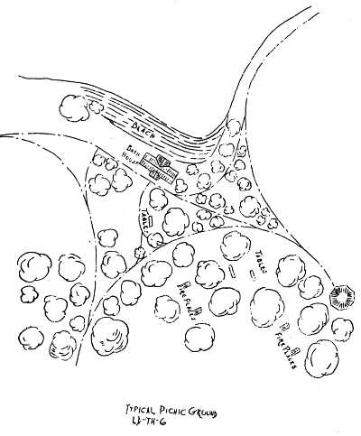 Farther up the lake in a wooded dale will be another picnic area and a kiddies play ground. Here will be located the overflow parking area for the lower levels. This area will be fitted with shelters, fire places, and water faucets.