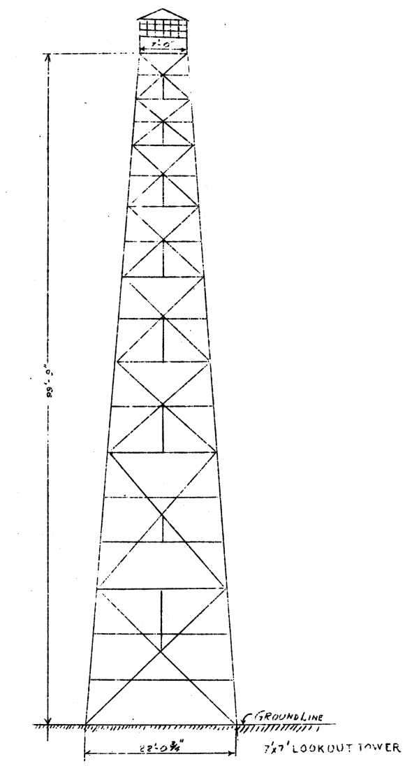 To protect this area from fire, adequate fire protection is planned. Two 60 foot steel fire towers are to be erected; one in the north end and the other in the southern part of the property. From these two lookout towers the entire area can be seen and during periods of the year when conditions are favorable to fire, a man will be stationed in each tower to keep a close watch over the whole area. A fire break is to be built and maintained around the entire area. This is to consist of a line following the outside boundary on which for a width of eight feet all brush and most of the trees are to be cut. Then a path or trail 4 feet wide is to be built in which all grass, etc. is to be cleaned off. This path will afford a means of access to any point on the boundary and afford a starting point to check any fire burning in from adjoining properties.