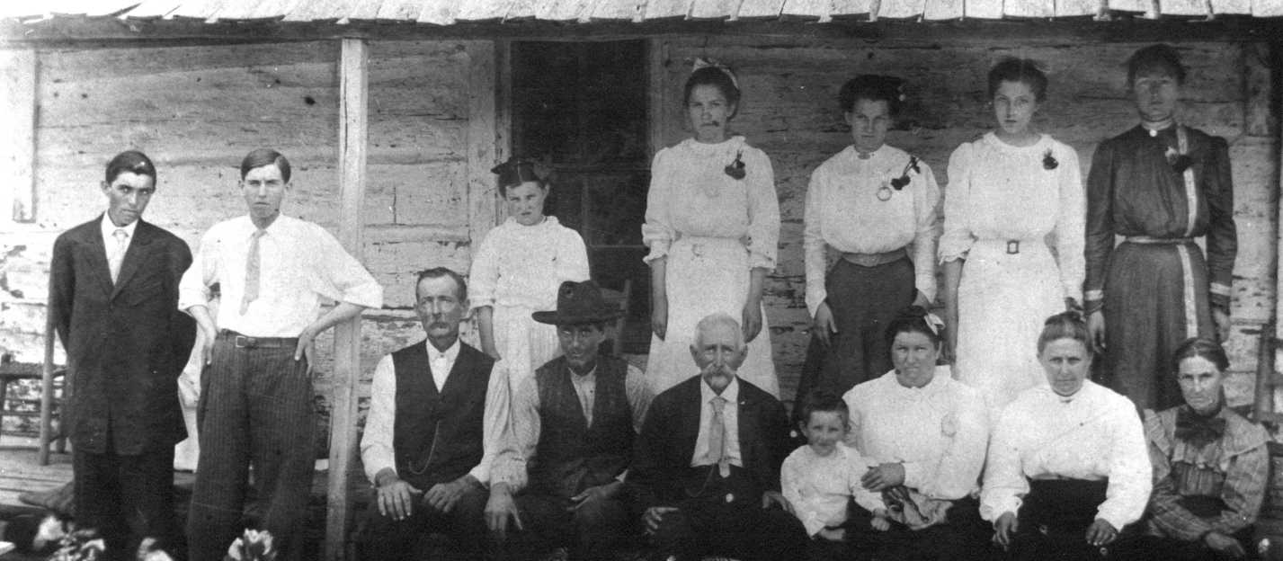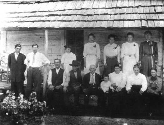 Home of Tom and Molly Cary. Tom Cary's home was about 1/2 mile west of the horse camp on Bucksnort Trail. Photo circa 1908. Standing L-R: Columbus Gibson, Donnie Tubbs, Francis Cary Hendrix, Ervie Gibson Smith, Elzana Tubbs Dean, Anna Gibson Pinkley, Rose Allen Todd. Seated L-R: John Allen, A. A. Greener, Tom Cary (owner), Alvin Cary, Molly Waugh Cary, Paralee Greener, Paralee Allen.