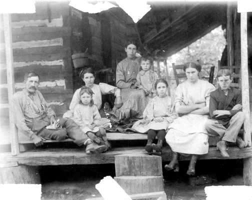 This photograph is from Hurchel Cary. He cannot identify the family but is sure it is some of his relatives. What is important is that this is a typical scene of life in the area before the park was established. Shown is a double pen dogtrot style house constructed of log, the earliest house style common in the area. This particular house has had an addition in the rear on one side making an L-shaped house, and a rear porch makes a right angle to continue the line of the dogtrot along the left side of the addition. These dogtrots and porches were major living and work areas for families. It is a place for children to play and pets to sleep. A woman might sit on the porch as she mended clothes or shelled peas. On days too wet to work in the fields, older boys and men might sit on the porch or in the dogtrot as they sharpened tools or repaired tack. It is a dry place where family members could remove dirty shoes before entering the indoor areas. Finally, if anyone had free time, it is a place to sit and watch the world pass by.