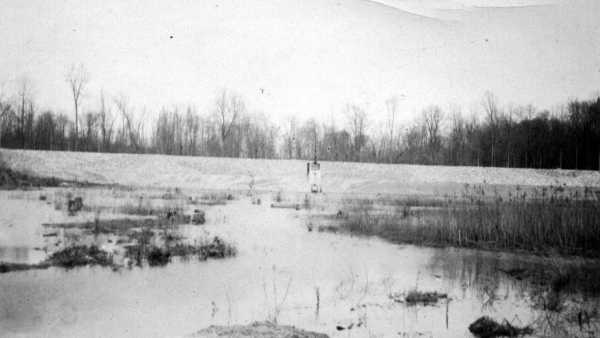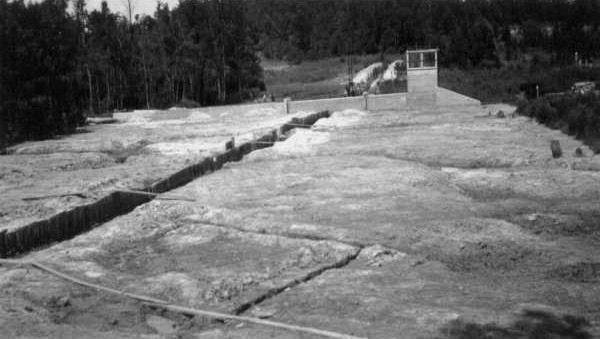 The following photographs are from the collection of Natchez Trace State Park. In 2001 they were on a photo album page labeled "Spillway of Cub Creek Lake." The originals were 4" x 2½" snapshots.