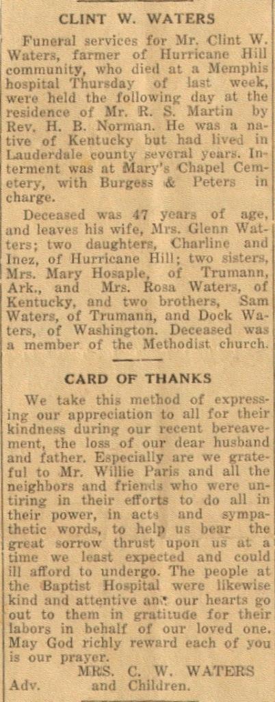 Funeral services for Mr. Clint W. Waters, farmer of Hurricane Hill community, who died at a Memphis hospital Thursday of last week, were held the following day at the residence of Mr. R. S. Martin by Rev. H. B. Norman. He was a native of Kentucky but had live in Lauderdale county several years. Interment was at Mary's Chapel Cemetery, with Burgess & Peters in charge.