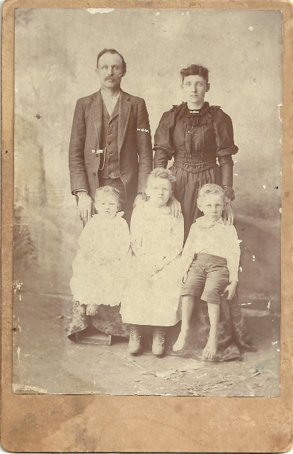 This photo is William Harvey and Callie with their children Minnie, Hermon and Florence and was made about 1893 - based on the age of the children and the absence of Sterling. The children left to right are Florence, Minnie and Hermon. |
