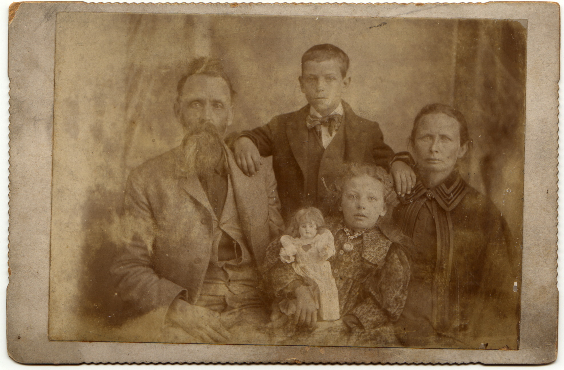 | Charles C. Collester and his family, circa 1881 (1883?). His wife's name is Mary Jane, the little girl's name is Emma, and the boy's name is Albert. Charles married Mary Jane Mitchell on December 28, 1870 in Franklin County, Tennessee. This family lived in Franklin in Lauderdale County, Tennessee, in the 1880's and 1890's. The last record we have of them is his Civil War Pension listing him as an invalid in 1897. |