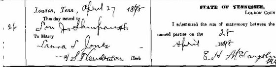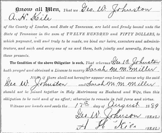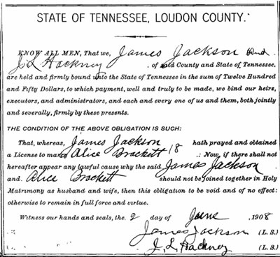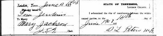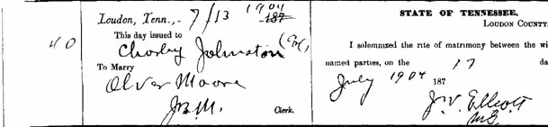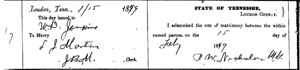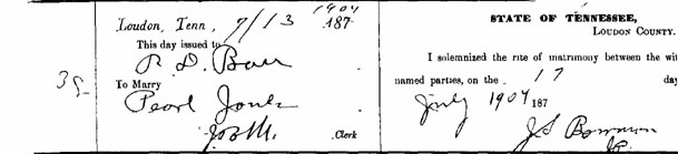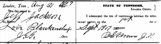 Brenda Oody has been visiting the Loudon County Courthouse and copying various marriage records. She has made copies and submitted them to the Loudon County TNGenWeb Site. Each certificate is linked under the grooms name and the bride's name. We would like to thank Brenda for her generous contribution.