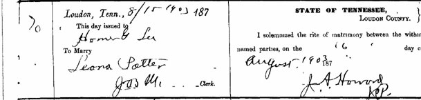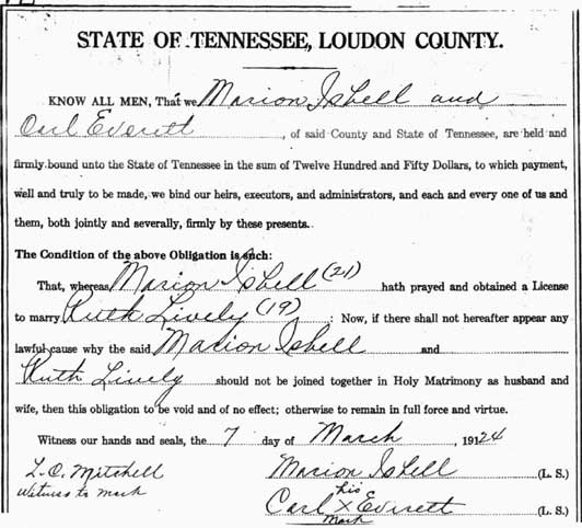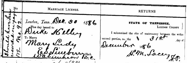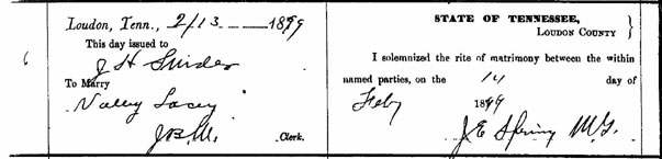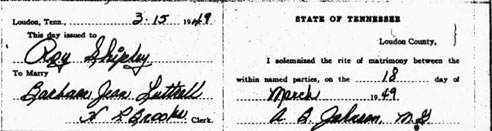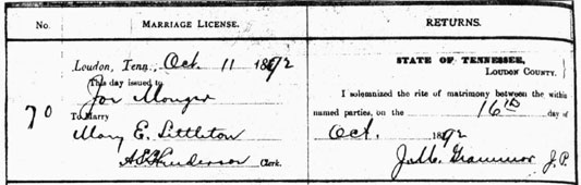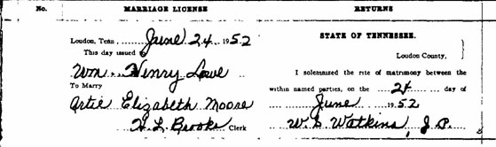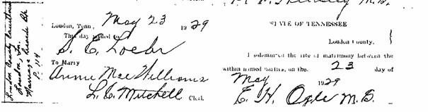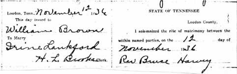 Brenda Oody has been visiting the Loudon County Courthouse and copying various marriage records. She has made copies and submitted them to the Loudon County TNGenWeb Site. Each certificate is linked under the grooms name and the bride's name. We would like to thank Brenda for her generous contribution.