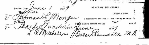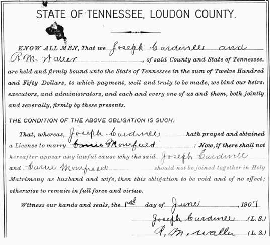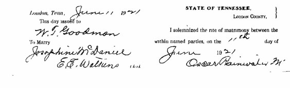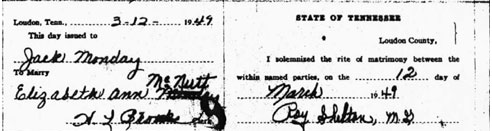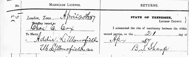Brenda Oody has been visiting the Loudon County Courthouse and copying various marriage records. She has made copies and submitted them to the Loudon County TNGenWeb Site. Each certificate is linked under the grooms name and the bride's name. We would like to thank Brenda for her generous contribution.