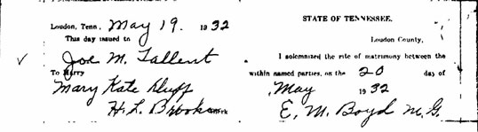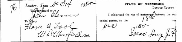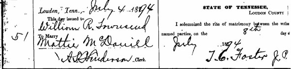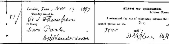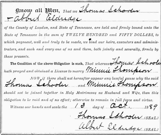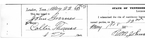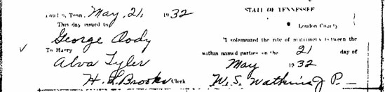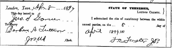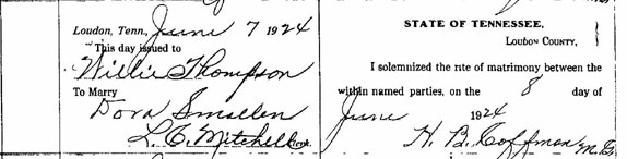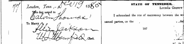 Brenda Oody has been visiting the Loudon County Courthouse and copying various marriage records. She has made copies and submitted them to the Loudon County TNGenWeb Site. Each certificate is linked under the grooms name and the bride's name. We would like to thank Brenda for her generous contribution.