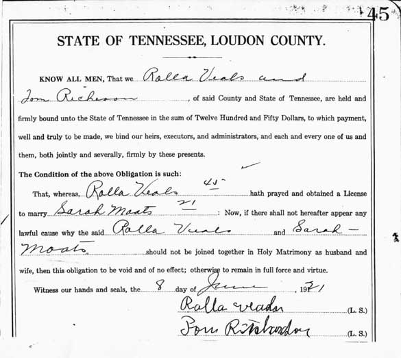 Brenda Oody has been visiting the Loudon County Courthouse and copying various marriage records. She has made copies and submitted them to the Loudon County TNGenWeb Site. Each certificate is linked under the grooms name and the bride's name. We would like to thank Brenda for her generous contribution.