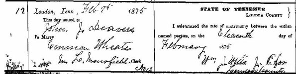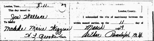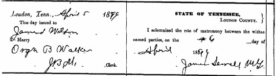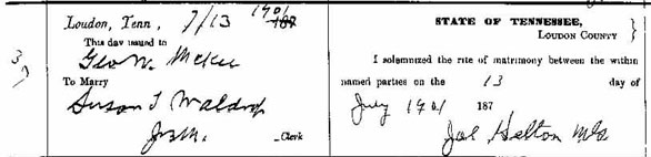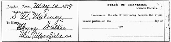 Brenda Oody has been visiting the Loudon County Courthouse and copying various marriage records. She has made copies and submitted them to the Loudon County TNGenWeb Site. Each certificate is linked under the grooms name and the bride's name. We would like to thank Brenda for her generous contribution.
