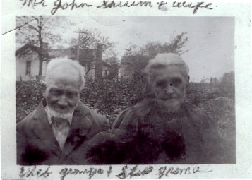 Pictured here is John Alexander Wakefield "Tinker" Shrum and his 2nd wife Arminda Gaines Shrum. According to his death certificate he was born 8 February 1838 in Macon County, TN. His occupation was watch tinker hence the nickname "Tinker." His father is listed as Peter Shrum who was supposed to have been born in Macon County, TN and his mother was Martha Caslin Gains b. in Allen County, Kentucky. We believe this to be a mistake because we know his first wife to have been Martha Gaines. Tinker died 23 day of November 1926 in the 4th district of Macon County, TN, he was single at the time of his death. He was buried in the Wright Cemetery located on Hwy 10S in Macon County. The informant listed here is Tinker's daughter, Artie (Mrs. Oscar) Brawner of the Hillsdale Community.
