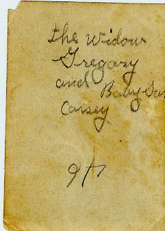 This picture was actually taken in Bug Tussle however, someone must have written on the back of the picture years after it was made because Katie's husband, Jasper, didn't die until 1957. Jasper was a half brother to the contributors grandfather, Norman Gregory. Their father was George A. Gregory. I do believe that Katie and Jasper were both born in Macon County, but I can't prove it so I just put TN. Here is what I have:
