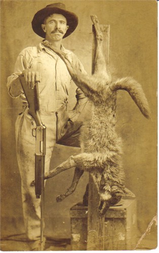 Berlin Doss— The back of the photo reads: Post card is addressed to "Unc. Bloof" and says, "Uncle Bloof i killed this wolf 80 yds. with BB shot but i knocked him down four times before he stayed he had killed ...was taking a shot....(illegible) |
