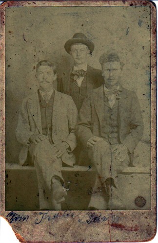 Freely Bandy and Friends--Front of picture says "Tom, Freelie, L(.....)" Back of photo says in original hand, "F.S. Bandy, T.C. Caruthers, L. ?. Caruthers |