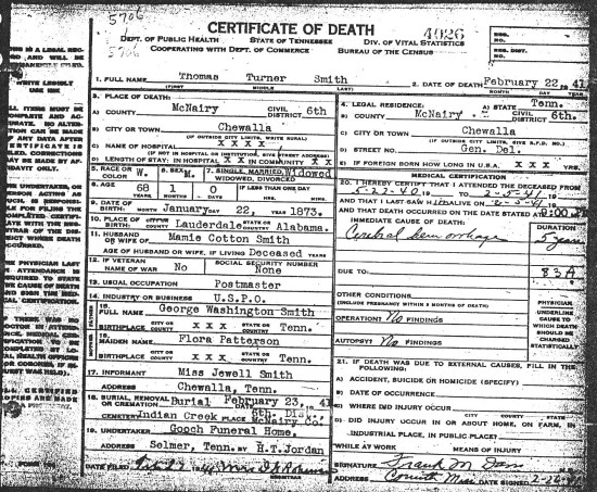 place of death-Chewalla, McNairy County, Tennessee, 6th