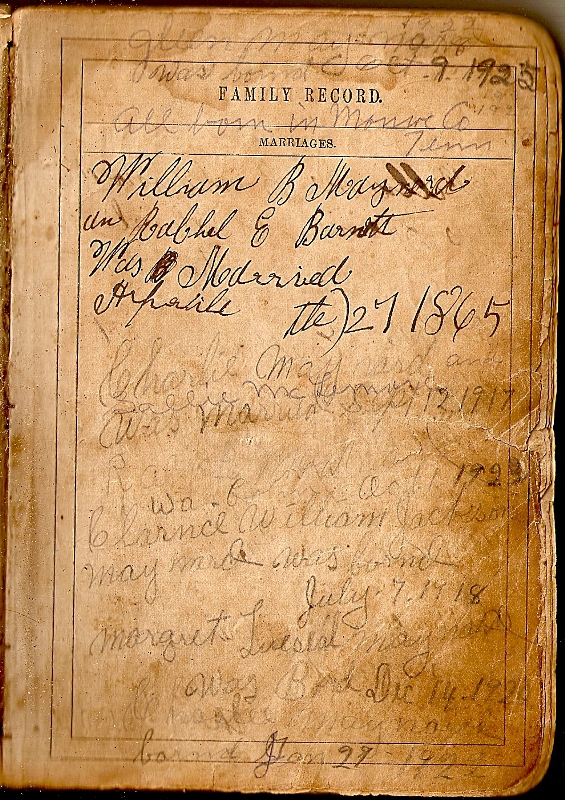 William B. (Jackson) Maynard and Rachel E. Barnett were married Aprile the 27, 1865.