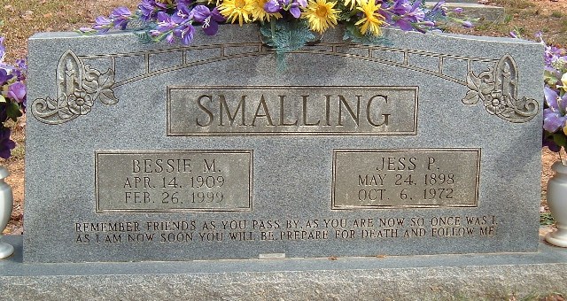 May 24, 1898 | October 6, 1972 | [Plot Bessie M.; Jess P.; S/o Robert & Mary Eliz. Bivens Smalling] |