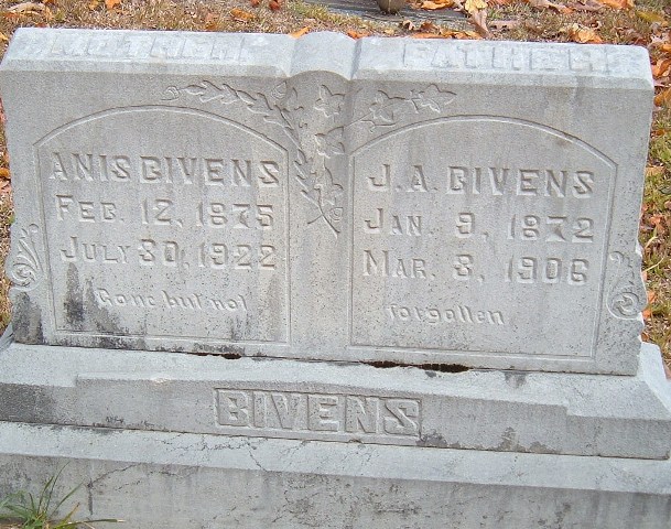 January 9, 1872 | March 3, 1906 | [Plot Anis; J.A.; S/o John & Eliza Yarberry Bivens] |