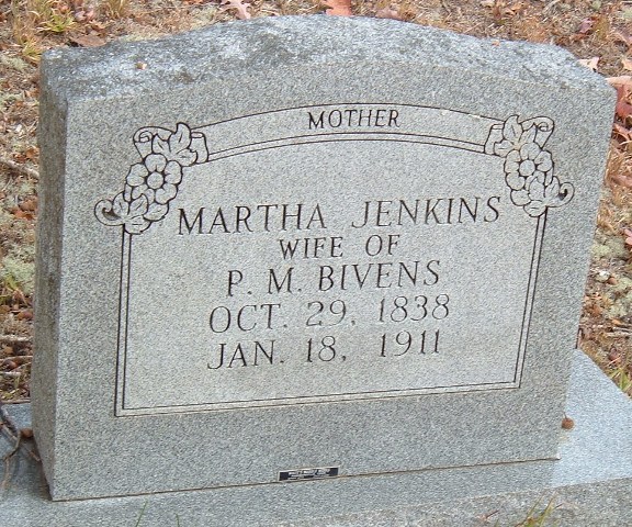 | Bivens, Martha Jenkins | October 29, 1838 | January 18, 1911 | Couldn't find stone. W/o Phillip M. Bivens |