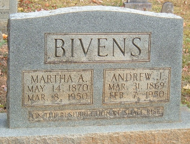 March 31, 1869 | February 7, 1950 | [Plot Martha A.; Andrew J.; S/o John & Eliza Yarberry Bivens] |