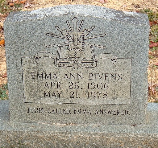 April 26, 1906 | May 21, 1978 | Jesus called, Emma answered. D/o Andrew & Martha Smalling Bivens |