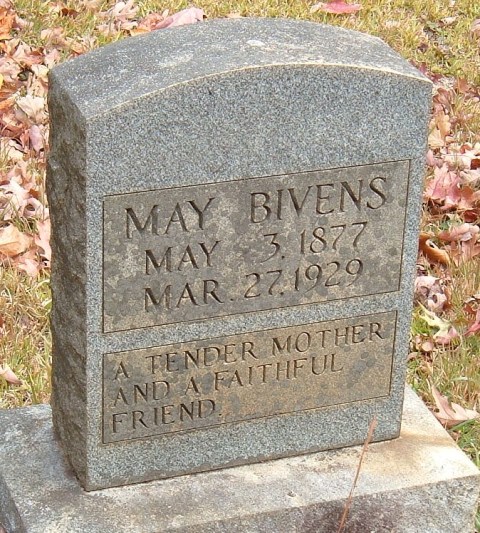 May 3, 1877 | March 27, 1929 | A tender mother & faithful friend.; W/o Luke Bivens; D/o James J. & Mary Laney Bivens |