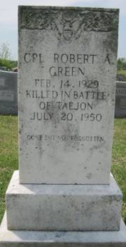 Corporal Green was a member of the 11th Field Artillery Battalion, 24th Infantry Division. He was Killed in Action while fighting the enemy along the Kum River, South Korea on July 20, 1950. Corporal Green was awarded the Purple Heart, the Korean Service Medal, the United Nations Service Medal, the National Defense Service Medal, the Korean Presidential Unit Citation and the Republic of Korea War Service Medal.