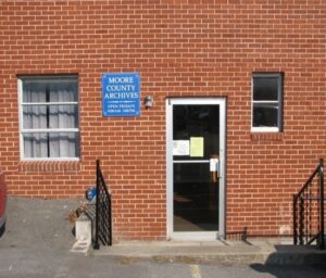 Note: The Moore County Archives is housed in the basement of the County Building. We preserve local county government records as well as historical, family, and genealogical records. Records not housed in the Archives are still in the courthouse. We are handicap accessible.