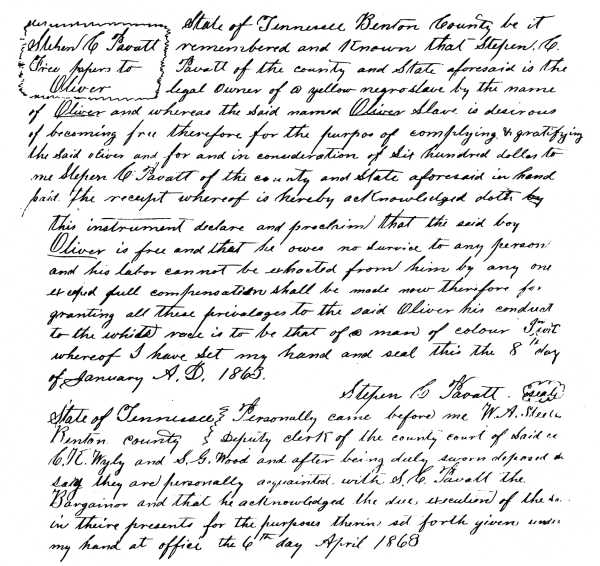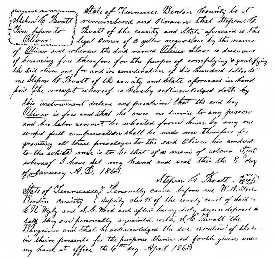 Of interest, here, was the man of the young couple, the long-time servant named OLIVER PAVATT who was born about 1825 in Davidson County, Tenn.). Judge Pavatt sold Oliver to his brother, Felix Pavatt, in August 1844 for $500 but after this brother's early death, Oliver somehow came back to