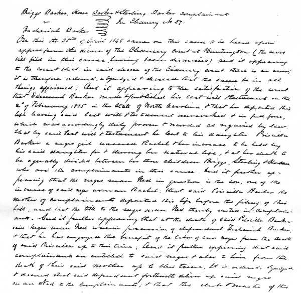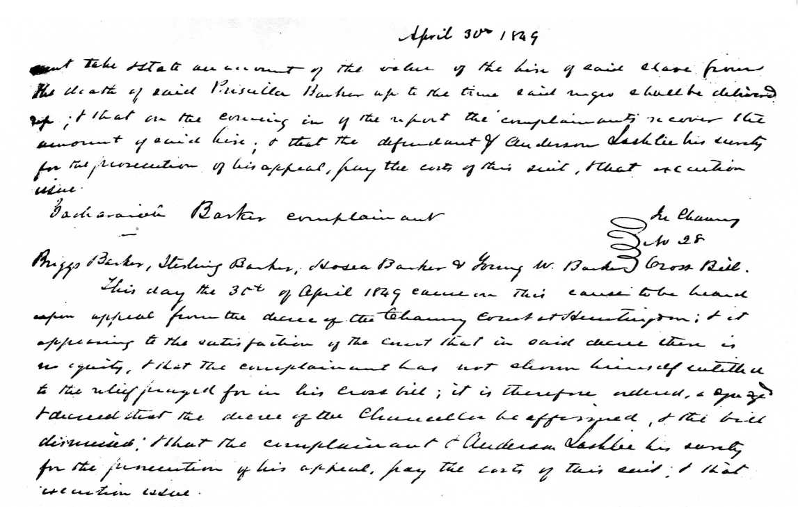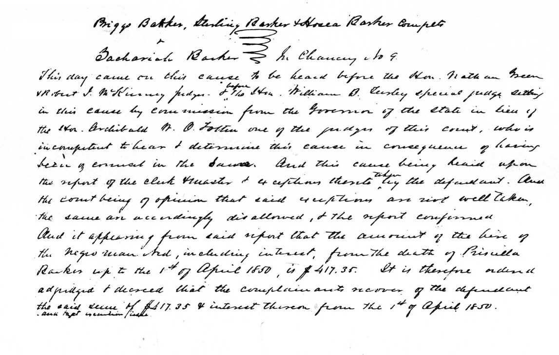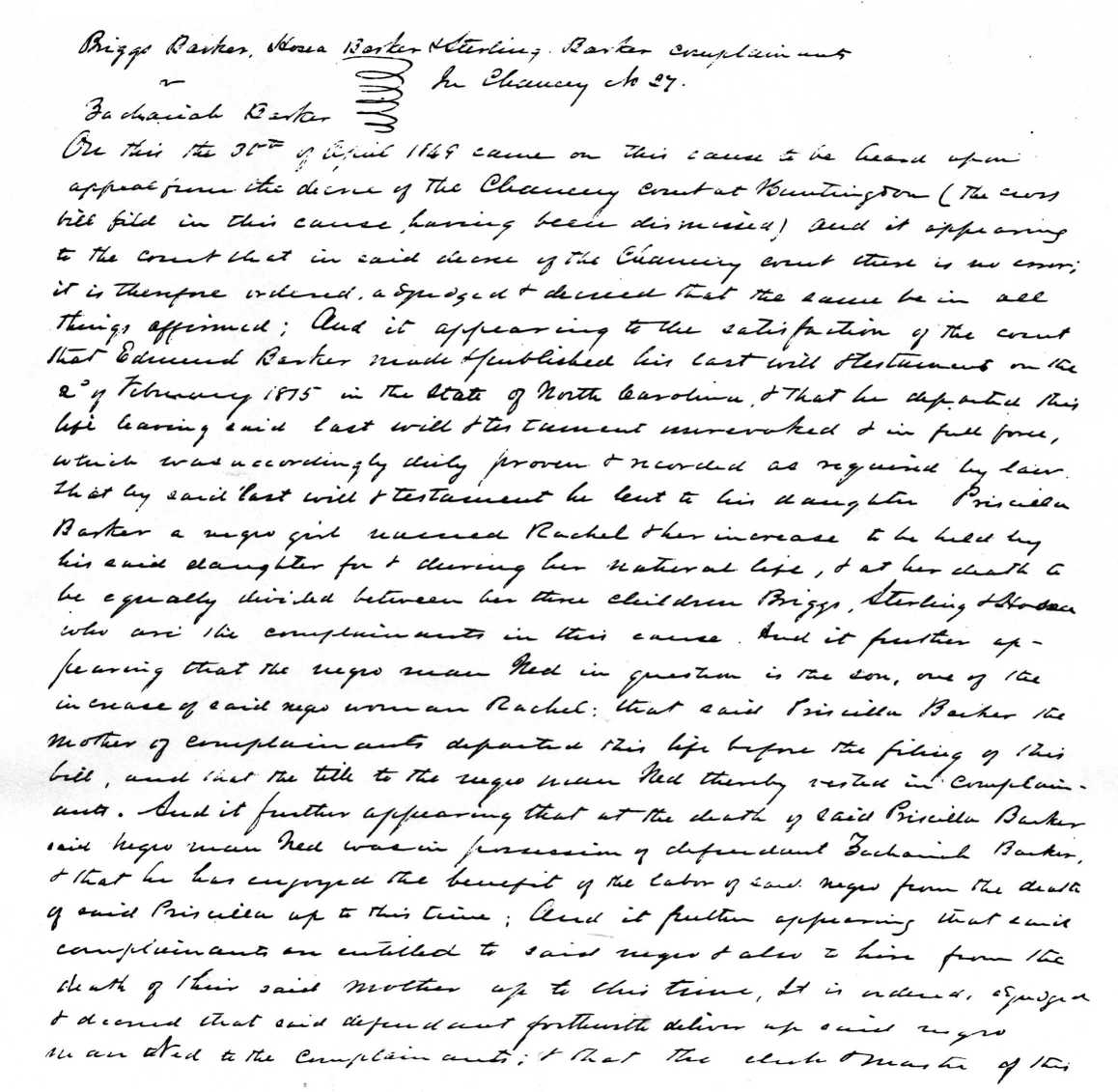 In 1815, EDMUNDS BARKER, Sr. of Wake County, North Carolina bequeathed a slave, RACHEL, to his daughter, Prisciller, wjfe of Brittain Barker; after her demise this slave was to descend to her sons Briggs, Sterling and Hosea Barker. Brittain Barker and family moved to Tennessee and in 1834 he sold Ned, Rachel's son, to Zachary Barker. (Benton County Deed Book B, page 255) Years later, in 1846, Sterling Barker of Ballard County, Kentucky and Young Barker of Shelby County, Tennessee made a claim on Ned. Briggs and Hosea Barker of the latter county appointed Young Barker as their representative to secure their claim on this slave also. (IBID. pages 334, 336) Zachary Barker apparently acted in good faith when he purchased the slave, unaware of the condition of Edmunds Barker's will. He and the other Barkers went into court where it was decided against Zachary Barker as the entries in the SUPREME COURT MINUTE BOOK, 1841-1850 reveal: