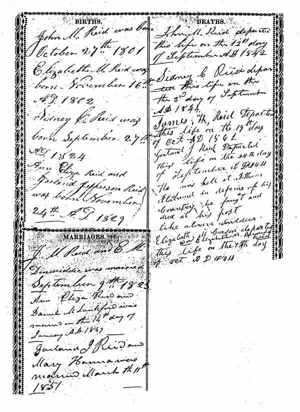 Born Sept. 27, 1844 Died Sept. 3, 1844NOTE: According to the John Miller Reid family Bible record, published by the C. Alexander & Company, Philadelphia, 1834, owned now by Cynthia Billingsley Kemp, Hico Road, McKenzie: John M. Reid was born Oct. 27, 1801; he died Sept. 12, 1842; married Elizabeth Dinwiddie, Sept. 9, 1823. She was born Nov. 16, 1802 and died Oct. 9, 1864. Their son, Sidney C. Reid, was born Sept. 27, 1824died Sept. 3, 1844.
