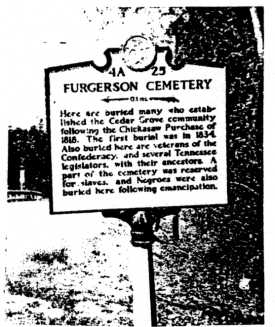 Here are buried many who established the Cedar Grove community following the Chickasaw Purchase of 1818. The first burial was in 1834. Also buried here are veterans of the Confederacy, and several Tennessee legislators. with their ancestors. A part of the cemetery was reserved for slaves, and Negroes were also buried here following emancipation.
