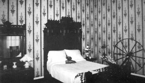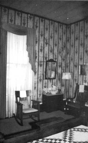 paper was imported from England in 1864. The bedroom furniture was made of satin walnut, veneered