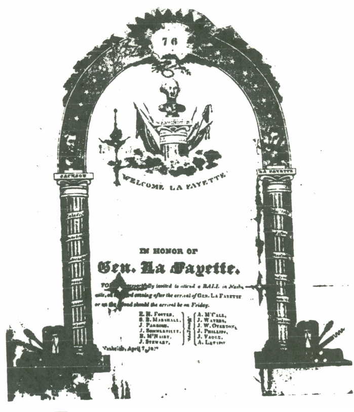 A copy of the La Fayette Ball Invitation was not included in Jonathan Smith's Nashville Daily American, 1876, A Genealogical Scrapbook. This copy of the La Fayette invitation comes from a book written by my uncle James G. Horsfall entitled The Vaulx Road for 900 Years. I know my uncle put a copy in Nashville in the Archives. There is another copy in the Tennessee Room, Jackson-Madison County Library. The Joseph Vaulx mentioned as a manager was the brother of my gg grandfather, James Vaulx of Jackson.