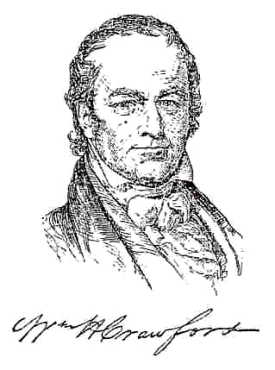 CRAWFORD, William Harris, statesman, b. in. Amherst county, Va., 24 Feb. 1772; d. in Elbert county, Ga., 15 Sept., 1834. His father, who was in reduced circumstances, removed first to South Carolina and then to Columbia county, Ga. After teaching school at Augusta the boy studied law, began practice at Lexington in 1799, and was one of the compilers of the first digest of the laws of Georgia. He became a member of the state senate in 1802, and in 1807 was chosen U. S. senator to fill a vacancy. The political excitement of the period led him to engage in two duels, in one of which his opponent fell, and in the second of which he was himself wounded. He was re-elected in 1811, acquiesced in the policy of a U. S. bank, and in 1812 was chosen president pro tem. of the senate. He was at first opposed to the war with Great Britain, but eventually gave it his support; and in 1813, having declined the place of secretary of war, accepted that of minister to France, where he formed a personal intimacy with Lafayette. In 1816, on the retirement of Mr. Dallas, he was appointed secretary of the treasury. He was prominently urged as a candidate for the presidency, but remained at the head of the treasury department, where he adhered to the views of Mr. Jefferson, and opposed the federal policy in regard to internal improvements, then supported by a considerable section of his own party. This position on the great question of the time subjected him to virulent hostility from opponents of his own party; and Mr. Calhoun, who was one of these opponents, became a dangerous rival for the democratic nomination for the presidency, to succeed Monroe. Crawford, however, as the choice of the Virginia party, and the representative of the views of Jefferson, secured the nomination of a congressional caucus in February, 1824; and in the election that followed he received the electoral votes of Virginia and Georgia, with scattering votes from New York, Maryland, and Delaware — in all, 41. No choice having been made by the electoral college, the election reverted to the house of representatives, where John Quincy Adams was elected over Jackson and Crawford, through the influence of Henry Clay, the fourth candidate before the people, who brought his friends to the support of Adams. The result was also due, in a measure, to the confirmed ill health of Mr. Crawford, and perhaps to imputations brought against his conduct of the treasury department. These charges he promptly refuted, and a committee that included Daniel Webster and John Randolph unanimously declared them to be unfounded. But his health rendered it impossible for him to continue in public life; and, although he recovered his strength partially, he took no part after this date in politics. Returning to Georgia, he became circuit judge, which office he continued to fill with great efficiency, by successive elections in 1828 and 1831, until nearly the end of his life. He had no connection with the nullification movement, to which he was opposed; and his last days were spent in retirement. Personally he was a man of conspicuous social gifts, an admirable conversationalist, religious in his views and feelings, and a supporter of Baptist convictions. At his home he dispensed a hearty republican hospitality, and his name is eminent among the illustrious citizens of Georgia.