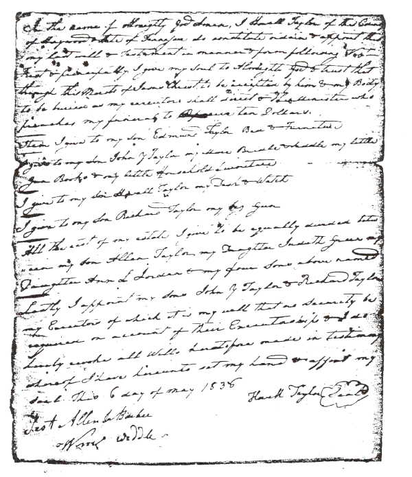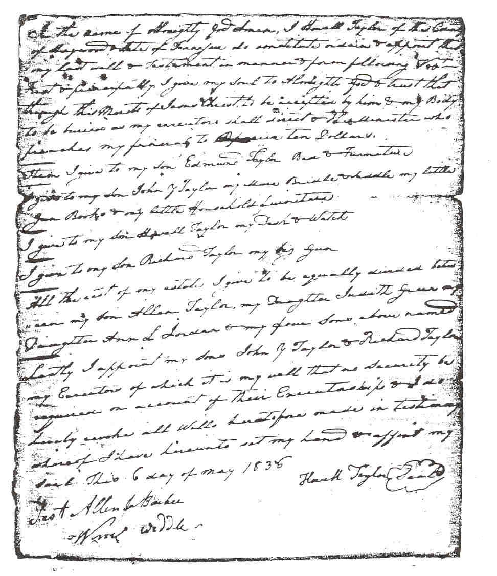 Howell Taylor had disposed of most of his temporal possessions late in life but he executed a last will and testament, May 6, 1836 which was probated September 1, 1845 (Haywood County Court Minute Book D, page 266); the original will was photocopied years ago before it disappeared from the Haywood County courthouse, as well as the will book (number D) in which it had been recorded. The copy of the original will, itself a public document, having been probated in court, has been reproduced in this publication on page 58.