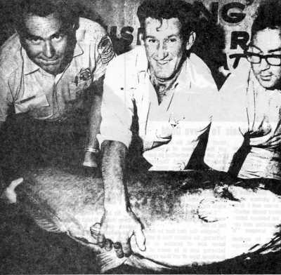 Joe said that he knew that the fish was a big one when he felt the weight on the line. The struggle to get him to the top of the water and into the boat took about one hour. Joe said, "I knew I could never get him into my dip net, so alter I finally got him alongside the boat, I got a hold in the gill plate, forcing him to open his mouth. Then I put my other hand inside the mouth and just fell back into the boat, pulling the fish with me, and landed with him on top of me. I put him into the live well of the boat, but he made such a commotion that I took him out and tied him into the bottom of the boat."