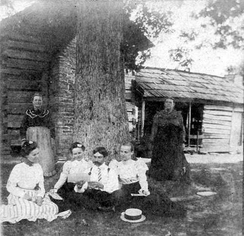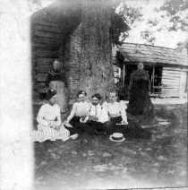 Among the Moore family photographs is a series of nine photographs mounted on square textured cardboard. All have identical mounting and appear to date from the same time. The occasion for the photographs may be a visit of James, Granville, Lige, and possible Margaret from Texas. Jesse Franklin Moore does not appear in the photographs and probably was married by this time. An example image is shown on the left.