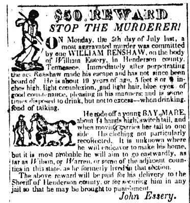 William Renshaw, born about 1810, was likely one of the children of the widow, Hannab Renshaw, who lived in Warren Co., Tenn. in 1820 and who followed her son, Abraham Renshaw, to Henderson County. There is evidence that this widow was related to the Essary family. (HENSHAW REFLECTIONS, by Grace Park Renshaw, Baltimore, 1983, page 143) It may very well be that William Renshaw and William Essary were kinsmen. John Essary/Essery was likely the father of William Essary; the former moved away from Henderson County in the mid-1830s, settling down in Alcorn County, Mississippi.