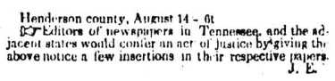 Mr. Jonathan Kennon Thompson Smith of Jackson has published seven genealogical miscellanies for Henderson County. He wishes to share this information as widely as possible and has granted permission for these web pages to be created. We thank Mr. Smith for his generosity. Copyright, Jonathan K. T. Smith, 2001