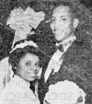 Following the wedding, the bride’s parents entertained with a brunch in the home of Mr. and Mrs. D. J. Robinson. A tempting menu was served from an attractive buffet setting. Assisting in the delightful courtesy was Miss Lesia Johnson, cousin of the bride, and Miss Verta Mosley. Miss Johnson served the wedding cake. The traditional tiered cake was decorated with daisies and roses. Corinthian pillars elevated the first tier, topped with a miniature bride and bridegroom. Rice bags were distributed by attendants.