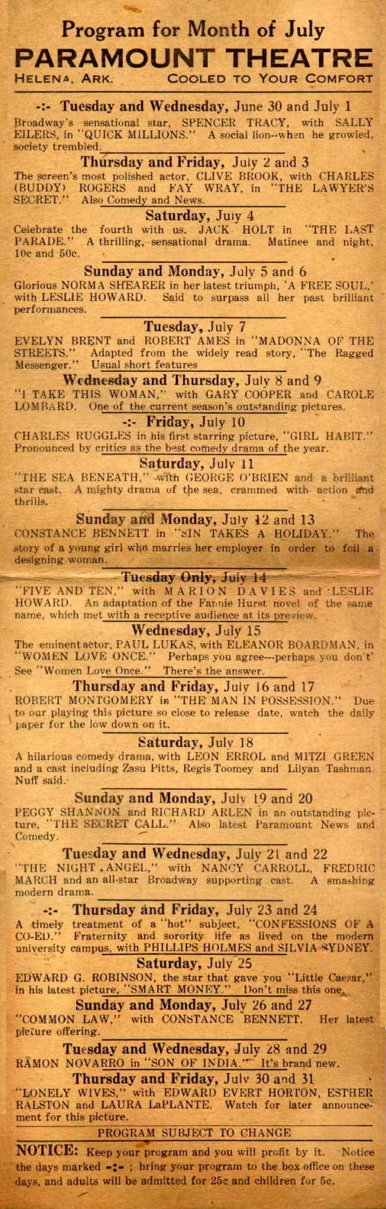 PROGRAM FOR THE MONTH OF JULY 1931, PARAMOUNT THEATRE, HELENA, ARK. From Imogene Oakley's Scrapbook