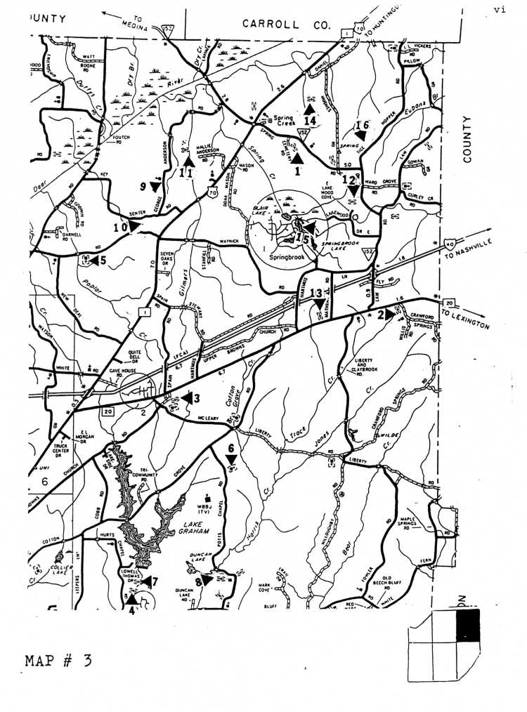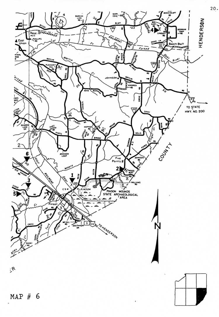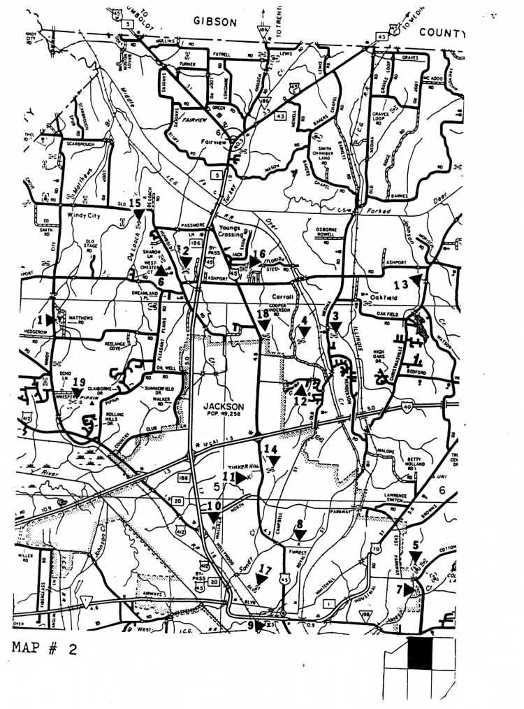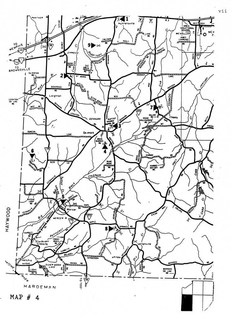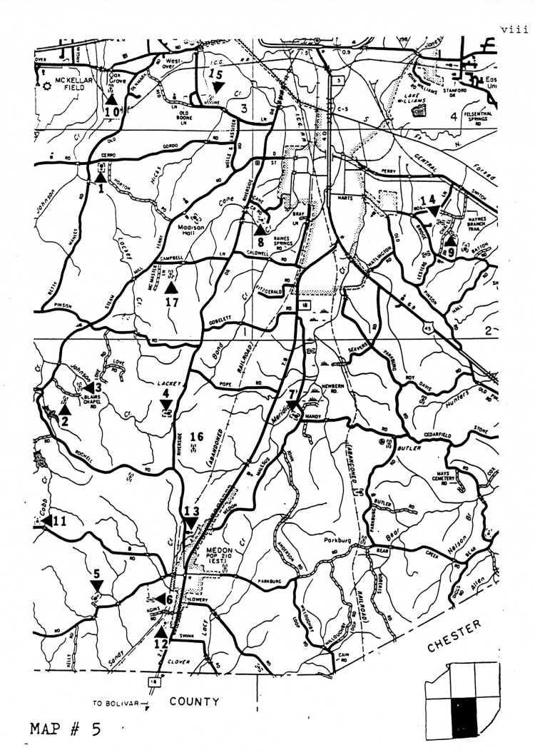 TENNESSEEPrepared by Mr. JAMES H. HANNA, civil engineer (ret.) ,Jackson, Tennessee, based on his fieldwork, using a list of black cemeteries with approximate locations furnished him by Mr. Jonathan Smith. Mr. Hanna marked the cemeteries on the map segments herein reproduced with triangles and numerals in order to designate specific locations of individual cemeteries. These map segments are part of the 1985 base map of Madison County, Tennessee prepared by the Planning Division, Bureau of Planning and Development, Tennessee Department of Transportation and are used in this publication as a courtesy of this agency. Mr. Hanna extended permission (on February 8,1995) to Mr.Smith to use "Map Locations of Black Cemeteries in Madison County, Tennessee" in Smith's supplement to his publication, TOMBSTONE INSCRIPTIONS FROM BLACK CEMETERIES IN MADISON COUNTY, TENNESSEE.